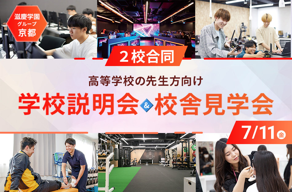 2校合同 学校説明会&校舎見学会 生徒の皆様のご指導にお役立ていただきたく滋慶学園グループ2校合同の学校見学会を行います。 開催日程 当日の集合場所・服装について 当日は京都デザイン&テクノロジー専門学校1F受付までお越しください。 持ち物は必要ございません。 他のイベントを探す