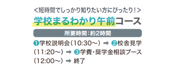 1 学校説明会(10:30-) ➡ 2 校舎見学(11:20-) ➡ 昼食 ➡ 3 在校生と座談会ブース(13:00-)➡ 4 お仕事体験(13:30-) ➡ 5 学費・奨学金相談ブース(14:30-) ➡ 終了 ● 所要時間:約4時間