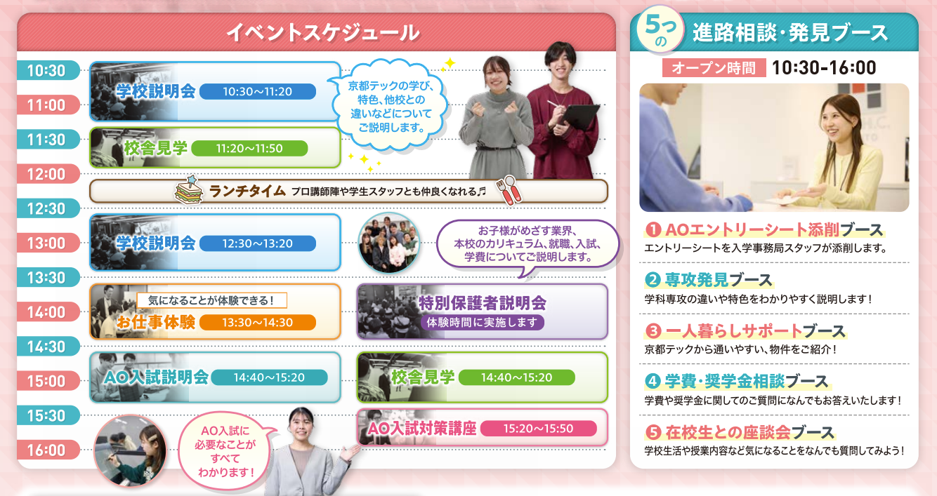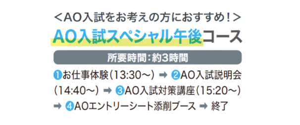 1 お仕事体験(13:30-) ➡ 2 AO入試説明会(14:40-) ➡ 3 AO入試対策講座(15:20-) ➡ 4 AOエントリーシート添削ブース➡ 終了 ● 所要時間:約3時間