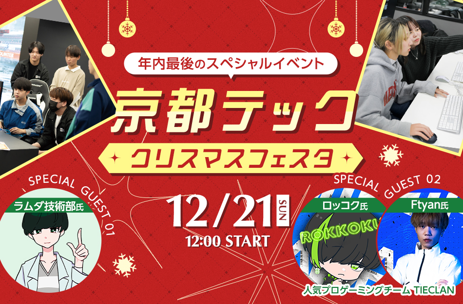 京都テッククリスマスフェスタ 年内最後のスペシャルイベント 開催日程 当日の集合場所・服装について 当日は京都デザイン&テクノロジー専門学校1F受付までお越しください。 持ち物は必要ございません。 他のイベントを探す